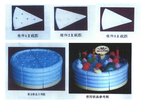 【案情】原告上海稚宜乐商贸有限公司是名称为“玩具(甜点组合)”外观设计专利的专利权人。该专利的组件视图显示,该专利有件1、件2、件3共3个不同的组件。该专利的简要说明记载,件1、件2、件3分别为8件,经插接组合而成。该专利的组合状态立体图也显示,每3个不同的组件经插接组合成玩具蛋糕的1/8扇形块体,8块完全相同的1/8扇形块体即组合成整体呈圆柱形的本玩具蛋糕外观设计专利。该玩具蛋糕外观设计专利产品的顶面和圆周侧面上具有与上述8个扇形块体相对应的分割线,在玩具蛋糕顶面上密布有小孔并且沿着顶面外周具有外凸的波浪形边缘,在玩具蛋糕的整个圆周侧面上沿高度方向具有波浪形的凹凸形状。