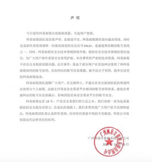 网易否认邮箱数据泄露 称系其他网站泄密被利用