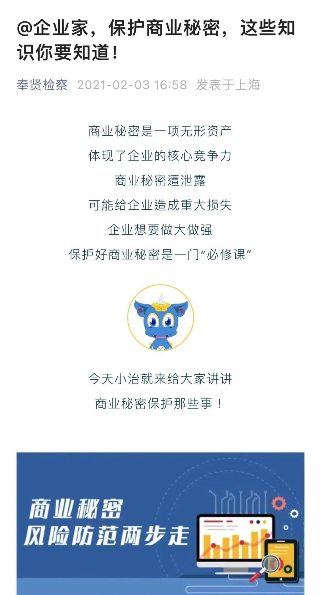 在今年疫情防控期间,“贤知卫”团队向企业发布20条“云办公”商业秘密保护防范建议,从完善保密制度、做好网络防护、加强硬件管理、依法维权等七大方面提供强效保护,有效提升企业在知识产权等方面的经营风险防范力度。