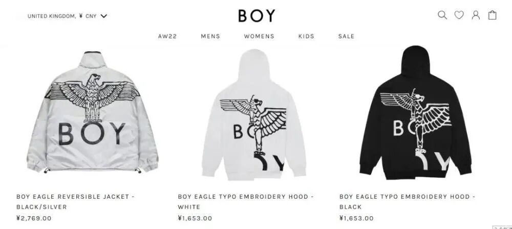 BOY LONDON 是来自英国的街头品牌鼻祖,由Stephane Raynor和John Krevine于1976年创立,第一家店设在当时英国朋克青年的聚集地 King Road(伦敦国王路),其独特的老鹰图形商标灵感来自于德国纳粹党徽“帝国之鹰”。