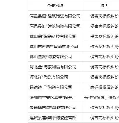 11家陶企因侵权商标失信