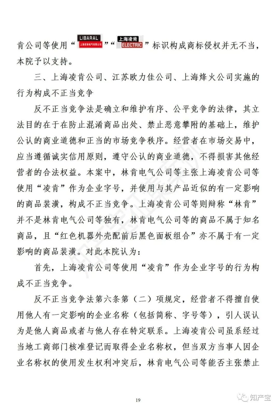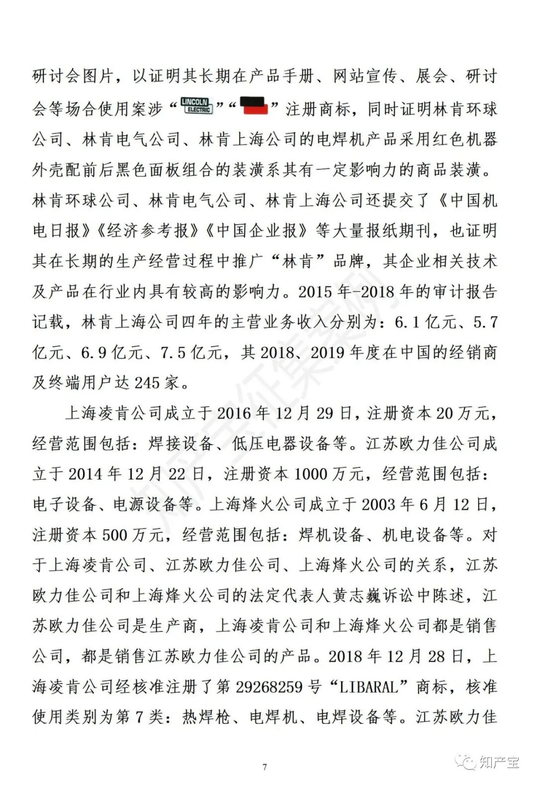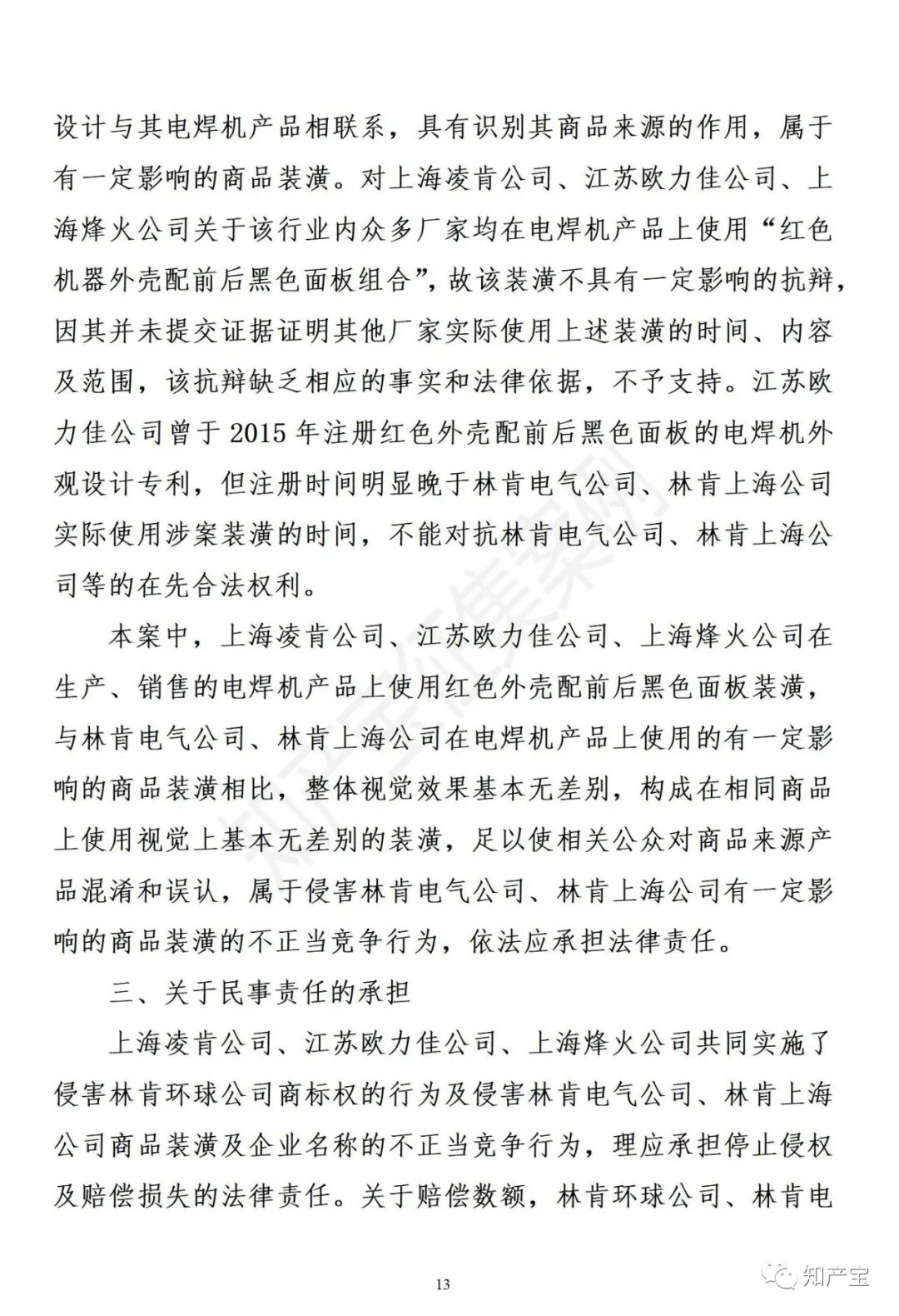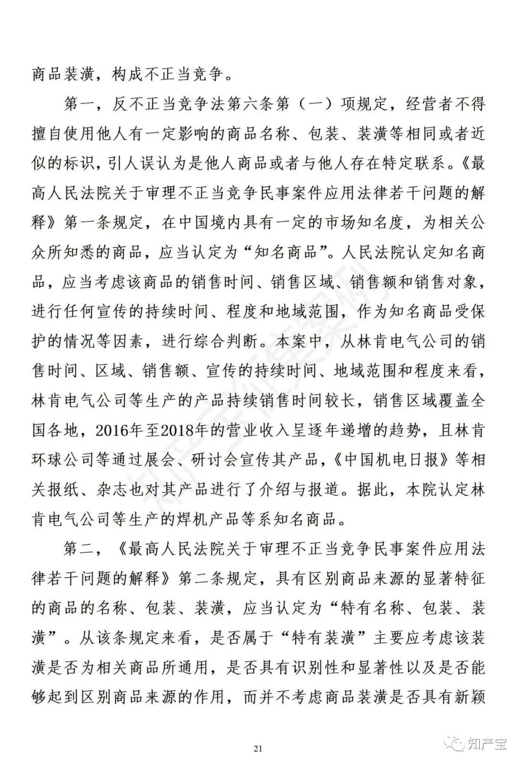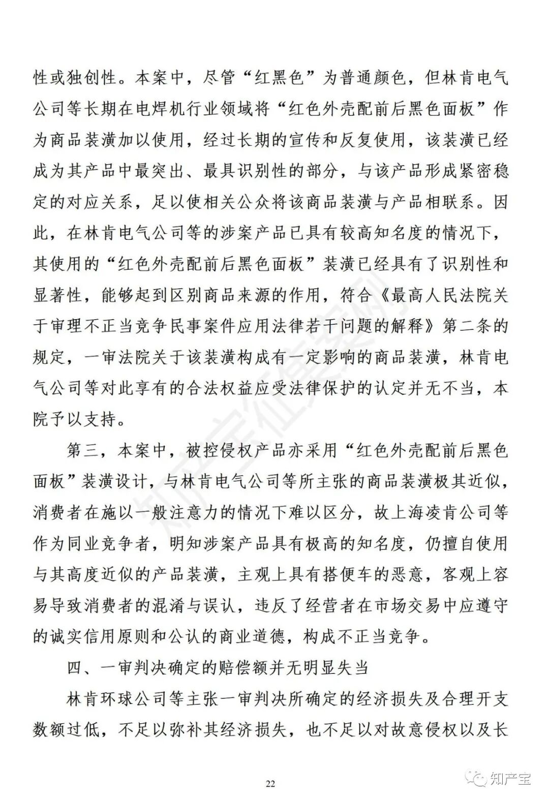 本案系对世界知名焊机企业商标、商品装潢及企业字号综合加以保护的典型案例。本案外商企业林肯电气公司系创建于1895年的跨国企业,在所属领域一直处于世界领先地位,被告从企业名称、商标、装潢等方面全方位仿冒,具有明显的侵权故意,侵权时间长,侵权规模较大。法院审理及判决坚持平等保护原则,有力保护了权利人的知识产权,维护了其合法权益,营造了良好的市场化法治化国际化营商环境。判决后,外商企业来信盛赞江苏法院“践行对知识产权的强化保护理念”,称本案的审理让其“感受到中国司法机关在知识产权保护、打造良好营商环境方面所取得的成果,也更加坚定了在中国进一步投资、发展的信心”。同时,本案判决对有一定影响的颜色组合商标及装潢保护范围及侵权认定作了有益探索,确定的裁判规则对今后类似案件的审理具有借鉴意义。该案入选江苏法院反不正当竞争十大典型案例(2019-2022)。 (2019)苏06民初712号 侵害商标权及不正当竞争纠纷 审 判 长 秦昌东 审 判 员 黄中华 审 判 员 姜安安 审 判 长 刘 莉 审 判 员 史 蕾 审 判 员 张长琦 上诉人(原审原告):林肯环球有限公司(THE LINCOLN GLOBAL,INC),住所地美国加利福尼亚州圣菲斯普林斯诺沃克大道9160号(9160 NORWALK BOULEVARD,SANTA FE SPRINGS,CALIFORNIA 90670,U.S.A.)。 代表人:KEVIN M.DUNN,该公司副总裁。 委托诉讼代理人:周欣超,上海天安涌道律师事务所律师。 委托诉讼代理人:徐乐凯,上海天安涌道律师事务所律师。 上诉人(原审原告):林肯电气公司(THE LINCOLN ELECTRIC COMPANY),住所地美国俄亥俄州克利夫兰市克莱尔大街22801号(22801 ST,CLAIR AVENUE CLEVELAND,OHIO 44117)。 代表人:KEVIN M.DUNN,该公司首席知识产权顾问。 委托诉讼代理人:周欣超,上海天安涌道律师事务所律师。 委托诉讼代理人:徐乐凯,上海天安涌道律师事务所律师。 上诉人(原审被告):上海凌肯电气有限公司,住所地中华人民共和国上海市嘉定区华江公路129弄6号J836室。 法定代表人:姜信节,该公司总经理。 委托诉讼代理人:顾铁军,江苏隆亿德律师事务所律师。 委托诉讼代理人:陈桂娟,江苏隆亿德律师事务所实习律师。 上诉人(原审被告):江苏欧力佳电子科技有限公司,住所地中华人民共和国江苏省南通市海门区包场镇浙海路299号。 法定代表人:黄志巍,该公司总经理。 委托诉讼代理人:顾铁军,江苏隆亿德律师事务所律师。 委托诉讼代理人:陈桂娟,江苏隆亿德律师事务所实习律师。 上诉人(原审被告):上海烽火焊机有限公司,住所地中华人民共和国上海市嘉定区嘉松北路6988号1幢1层105室J114。 法定代表人:黄志巍,该公司总经理。 委托诉讼代理人:顾铁军,江苏隆亿德律师事务所律师。 委托诉讼代理人:陈桂娟,江苏隆亿德律师事务所实习律师。 被上诉人(原审原告):林肯电气管理(上海)有限公司,住所地中华人民共和国上海市宝山区沪太公路5008弄195号1幢2楼。 法定代表人:VIVIAN W WANG,该公司董事长。 委托诉讼代理人:周欣超,上海天安涌道律师事务所律师。 委托诉讼代理人:徐乐凯,上海天安涌道律师事务所律师。 一、上海凌肯电气有限公司、江苏欧力佳电子科技有限公司、上海烽火焊机有限公司立即停止侵害林肯环球有限公司第5263370号“ 二、上海凌肯电气有限公司、江苏欧力佳电子科技有限公司、上海烽火焊机有限公司立即停止在生产、销售的电焊机产品上使用“红色机器外壳配前后黑色面板组合”装潢的不正当竞争行为; 三、上海凌肯电气有限公司、江苏欧力佳电子科技有限公司、上海烽火焊机有限公司立即停止对林肯电气公司、林肯电气管理(上海)有限公司“林肯”字号的不正当竞争行为。上海凌肯电气有限公司于判决生效之日起二个月内办理企业名称变更手续,变更后的企业名称中不得含有与“林肯”“LINCOLN”文字、读音相同或近似的文字; 四、上海凌肯电气有限公司、江苏欧力佳电子科技有限公司、上海烽火焊机有限公司于判决生效之日起十日内赔偿林肯电气公司经济损失及为制止侵权支出的合理费用共计648200元; 五、驳回林肯环球有限公司、林肯电气公司、林肯电气管理(上海)有限公司其他诉讼请求。 驳回上诉,维持原判。 《中华人民共和国商标法》第四十八条、第五十七条第(一)(二)(三)项、第六十三条,《中华人民共和国反不正当竞争法》第六条第(一)(二)项、第十七条,《最高人民法院关于审理商标民事纠纷案件适用法律若干问题的解释》第九条第二款、第十条、第十六条,《最高人民法院关于审理注册商标、企业名称与在先权利冲突的民事纠纷案件若干问题的规定》第四条,《中华人民共和国民事诉讼法》第一百七十条第一款第(一)项 裁判文书一审案号 二审案号 (2021)苏民终157号 案由 一审合议庭 书记员 马 茜 二审合议庭 法官助理 冉子蘅 书记员 杨 蕾 当事人 一审裁判结果 ”、第6800117号“