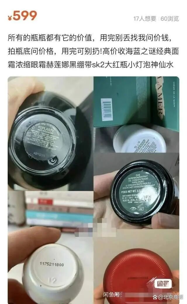 在闲鱼、小红书等平台收购账号中,黑绷带空瓶的价格在300-1000元,海蓝之谜、SK-II的则在100-300元之间。基本上卖出三四个空瓶子就能抵得上一瓶新品的价格。