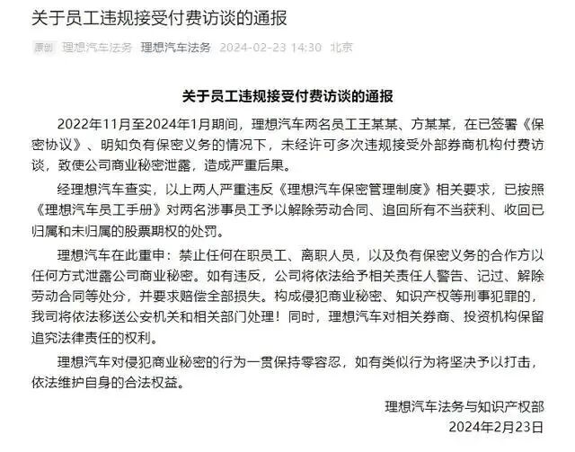 近日,理想汽车法务与知识产权部发布了一则《关于员工违规接受付费访谈的通报》披露:理想汽车两名员工在已签署《保密协议》、明知负有保密义务的情况下,未经许可多次违规接受外部券商机构付费访谈,致使公司商业秘密泄露,造成严重后果。理想汽车按照《员工手册》对两名涉事员工予以解除劳动合同、追回所有不当获利、收回已归属和未归属的股票期权的处罚。对此,理想汽车有关人士表示没有更多内容可以提供。业内专家表示,在当前新能源汽车高度竞争的背景下,造车新势力对泄密事件持零容忍态度。根据通报,2022年11月至2024年1月期间,理想汽车两名员工王某某、方某某,在已签署《保密协议》、明知负有保密义务的情况下,未经许可多次违规接受外部券商机构付费访谈,致使公司商业秘密泄露,造成严重后果。经理想汽车查实,以上两人严重违反《理想汽车保密管理制度》相关要求,已按照《理想汽车员工手册》对两名涉事员工予以解除劳动合同、追回所有不当获利、收回已归属和未归属的股票期权的处罚。理想汽车重申,禁止任何在职员工、离职人员,以及负有保密义务的合作方以任何方式泄露公司商业秘密。如有违反,公司将依法给予相关责任人警告、记过、解除劳动合同等处分,并要求赔偿全部损失。构成侵犯商业秘密、知识产权等刑事犯罪的,公司将依法移送公安机关和相关部门处理。同时,理想汽车对相关券商、投资机构保留追究法律责任的权利。理想汽车对侵犯商业秘密的行为一贯保持零容忍,如有类似行为将坚决予以打击,依法维护自身的合法权益。严厉惩罚泄密行为的并非理想汽车一家。就在2023年12月19日,小米集团发布关于小米汽车相关恶意泄密及谣言的声明称,近日,网上批量出现关于小米汽车的恶意泄密,以及不实谣言内容。2023年12月17日,媒体“ZAKER”员工包某某、“小白买车”员工关某某,在签署《保密承诺书》、明知保密义务与相应罚则的情况下,未经许可有意泄露保密拍摄内容。经小米集团保密管理团队查实,以上两人已承认其违反保密义务的行为。经与其所属媒体沟通,公司将依据双方签署的《保密承诺书》相应条款追究两人及所属媒体泄密责任,包括并不限于公开道歉、罚金。同时,小米集团查实,2023年11月和12月,小米汽车部三名前员工于在职期间,以收取“咨询费用”为目的,未经许可擅自参与外部券商、投资机构组织的所谓“小米汽车研讨会”,臆造传播大量错误、不实信息,严重误导市场、扰乱小米汽车正常业务开展。以上三名员工,即于某某(前电控系统与软件团队员工)、施某(前冲铸工艺团队员工)、张某(前量产质量团队员工),严重违背《小米集团员工行为准则》及公司规定的保密义务,小米集团己对其做辞退处理、永不录用,并依法追究法律责任。同时,小米集团对组织相关活动的券商、投资机构,保留追究法律责任的权利。小米公司发言人表示,对于恶意泄密、恶意造谣、传谣行为,小米集团将依法追究到底。“中国造车新势力对泄密事件零容忍。”有汽车行业分析师表示,相对于传统汽车企业,造车新势力处于高度竞争状态,非常重视保密工作。蔚来、理想、小鹏等多家新势力车企都成立了专业实力雄厚的法务部,有多个维权先例。尤其在新车上市临近,生产、销售、宣传各项工作抓紧推进的关键时期,相关商业秘密更被公司所重视。