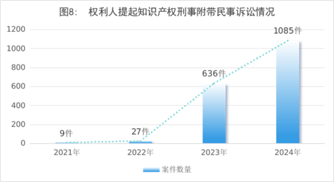 4.刑事附带民事诉讼案件量持续增长。起诉的侵犯知识产权犯罪案件中,权利人提起附带民事诉讼1085件,同比上升70.6%。2021年以来,知识产权刑事附带民事诉讼案件数量年均增长约3.9倍。